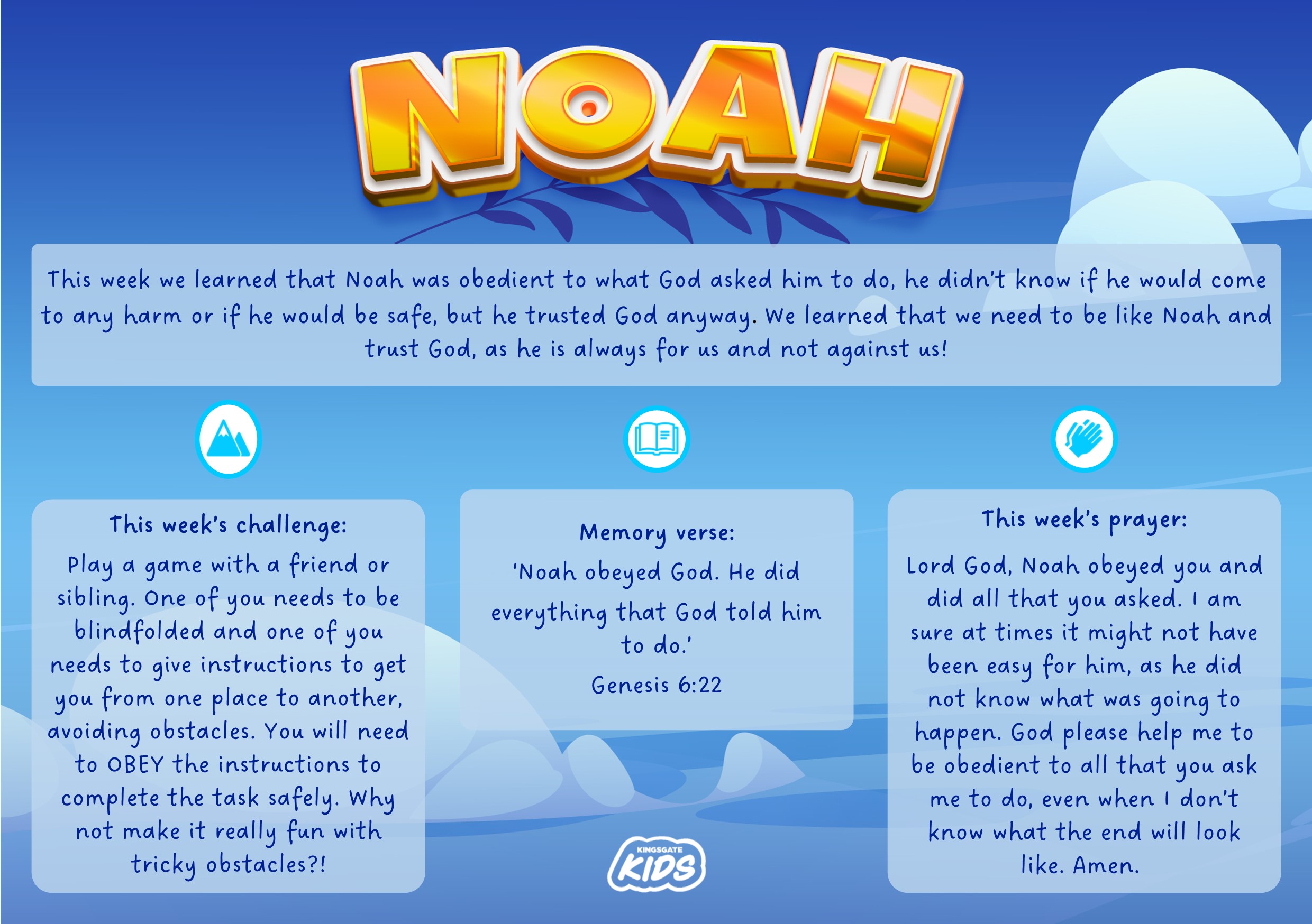 Lord God, Noah obeyed you and did all that you asked. I am sure at times it might not have been easy for him, as he did not know what was going to happen. God please help me to be obedient to all that you ask me to do, even when I don’t know what the end will look like.